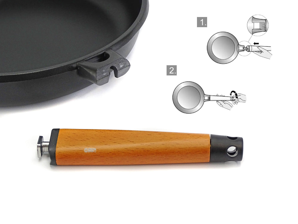 Töpfe und Pfannen aus Italien mit integrierter Deckelhalterung am Griff.