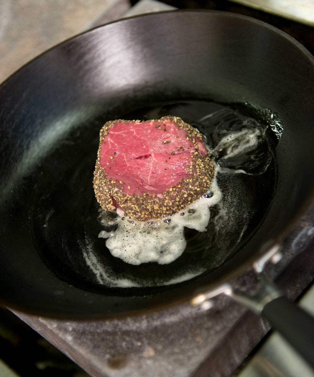 Die rohen Gusseisenpfannen in unserem Sortiment wurden bereits im Werk erstmals eingebrannt. Diese initiale Einbrennschicht ist die optimale Grundlage für die sich beim Braten und bei richtiger Pflege nach und nach bildende Patina.