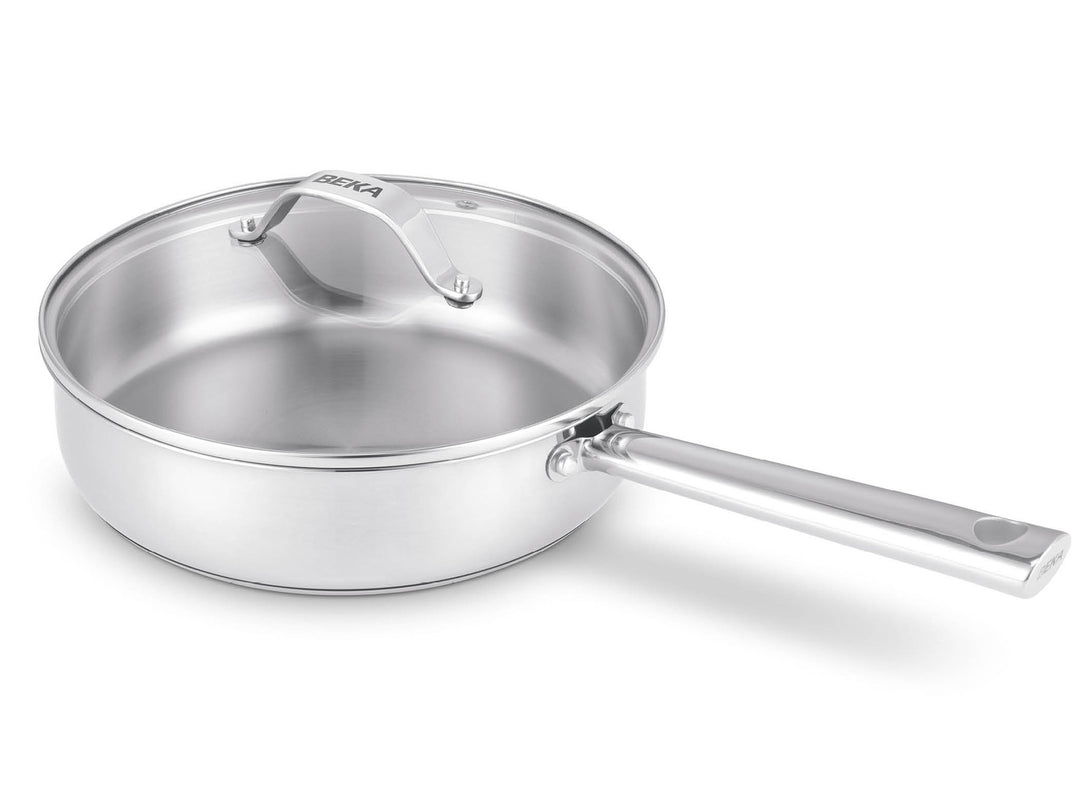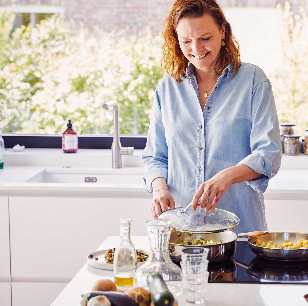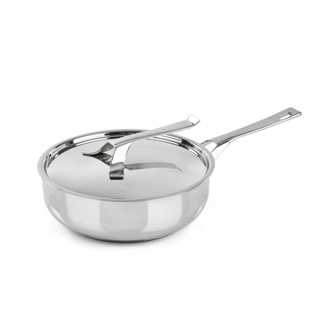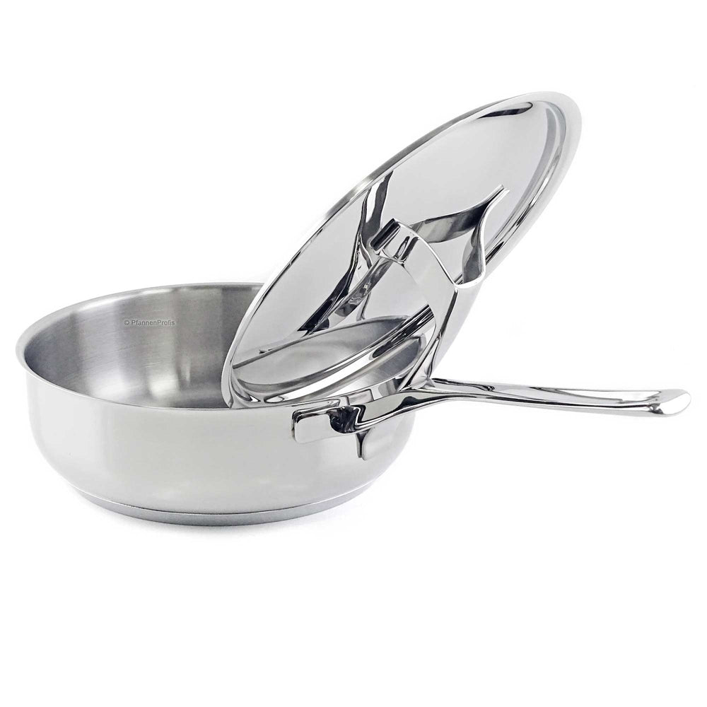Töpfe und Pfannen aus Italien mit integrierter Deckelhalterung am Griff.