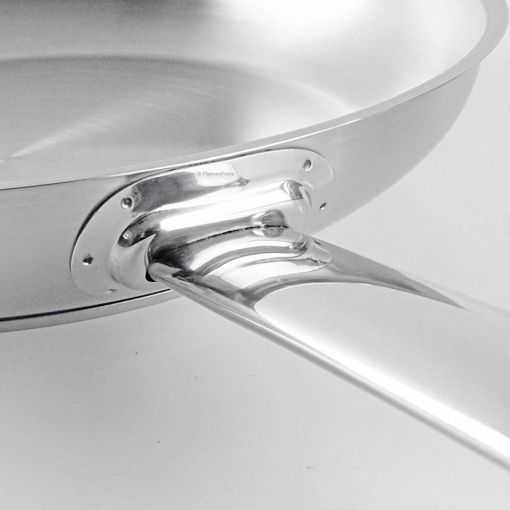 Die PROFESSIONAL Edelstahlpfanne hat einen starken, dreilagigen, verkapselten Thermoboden. Dieser sorgt für eine sehr gleichmäßige Wärmeverteilung auf der Bratfläche und eine gute Wärmespeicherung und trägt so zu einem guten Bratergebnis bei.