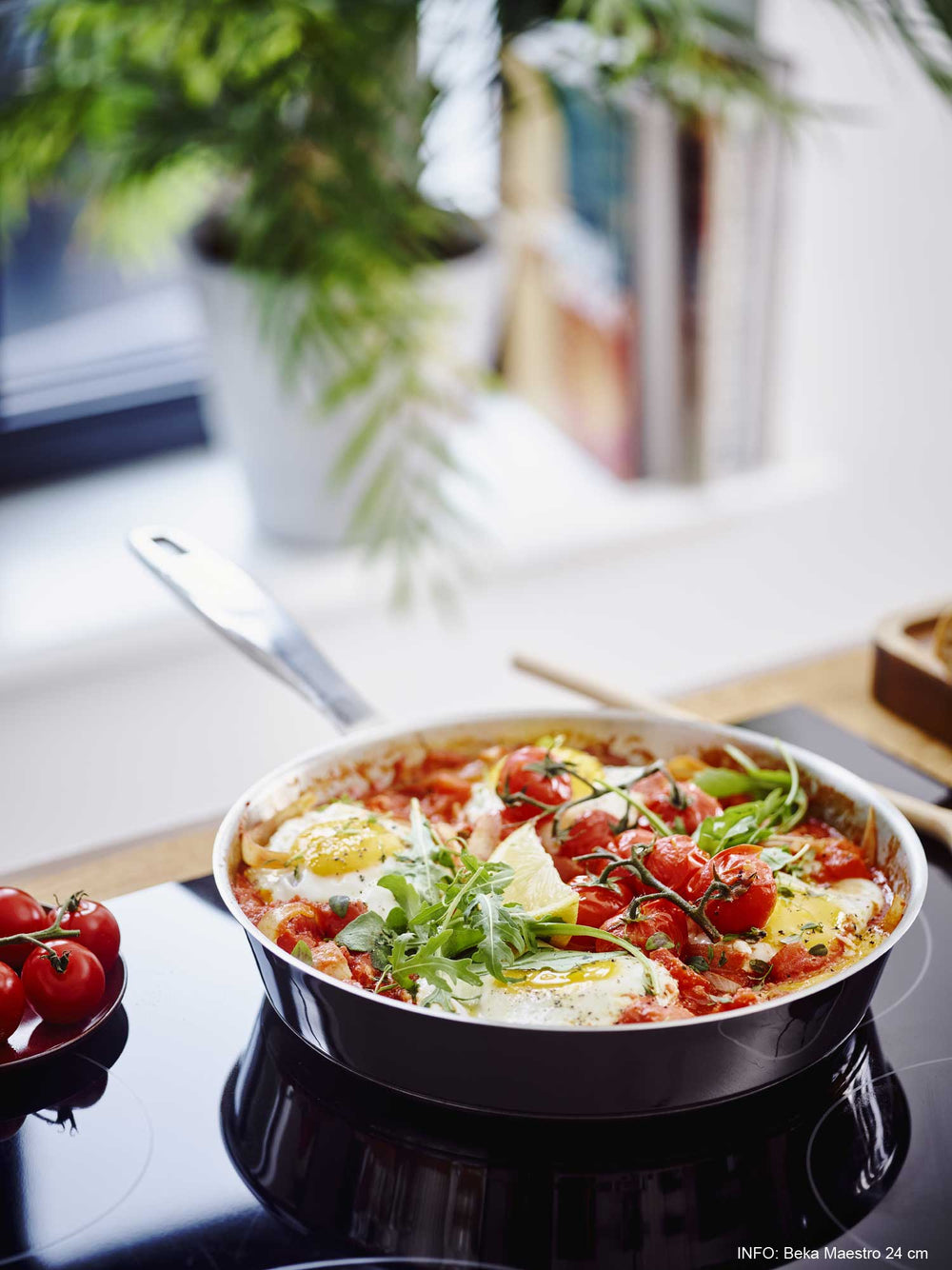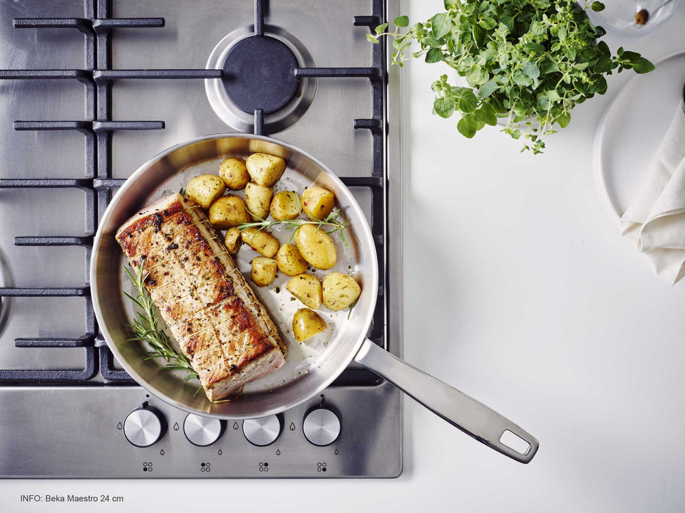 Auch zum Servieren bei Tisch eignen sich die attraktiven Pfannen und Töpfe dieser Serie daher gut: Der Deckel hält die Speisen warm, und zum Servieren wird der Deckel einfach (und ohne zusätzlichen Platzbedarf auf dem Tisch) am Griff „geparkt“.