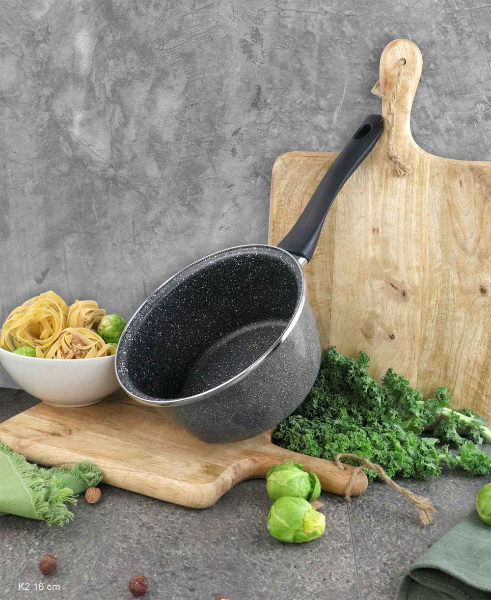 Grau-weiß meliert wie die von Schnee umwehten Flanken des gleichnamigen Berges präsentiert sich die K2 genannte Kollektion des spanischen Herstellers Vitrinor. Die K2 Stielkasserolle überzeugt als handlicher Allrounder z.B. für Soßen, Pudding, Porridge etc.