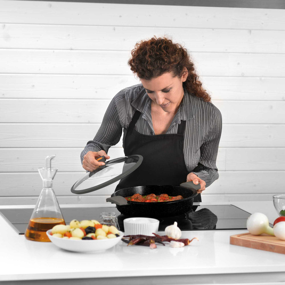 Die Vulcano Schmorkasserolle ist mit ihrem hohen Rand ideal zum schonenden Schmoren und Garen geeignet und zeigt sich durch die Silikongriffe besonders nutzerfreundlich. Der im Lieferumfang enthaltene Glasdeckel hat ebenfalls eine Einfassung aus Silikon und verhindert damit lästiges Deckelklappern und ist schonend zum Pfannenrand.