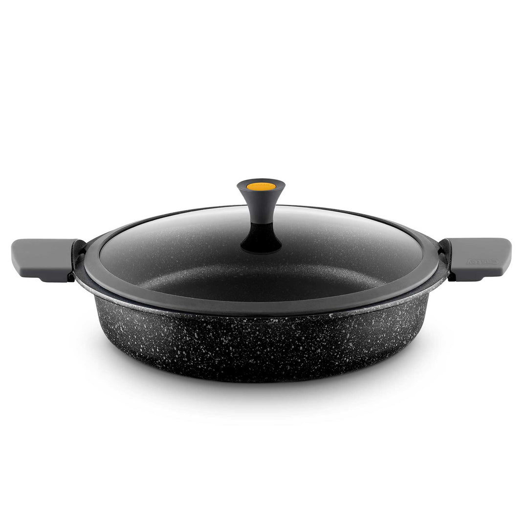 - Antihaft-Schmorkasserolle aus Aluminiumguss mit innovativem FULL INDUCTION Allherdboden und Glasdeckel.