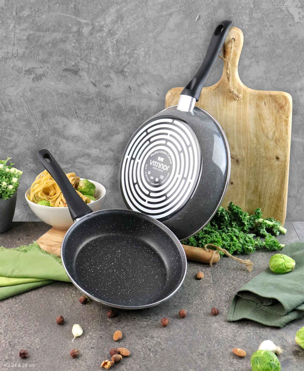 Grau-weiß meliert wie die von Schnee umwehten Flanken des gleichnamigen Berges präsentiert sich die K2 genannte Kollektion des spanischen Herstellers Vitrinor. Die kleine K2 Bratpfanne überzeugt als handlicher Allrounder in Gebrauch und Pflege.
