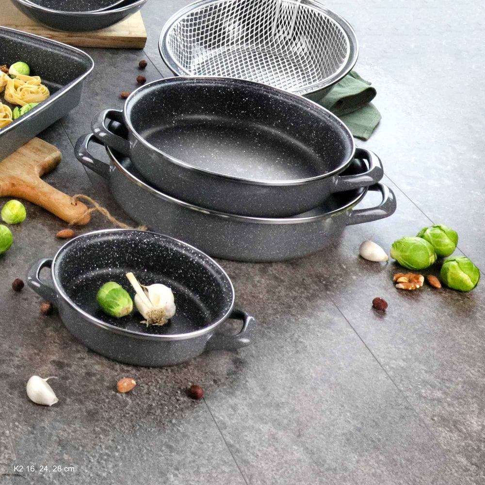 • Rundum versiegelt mit Emaille, außen grau-weiß meliert.