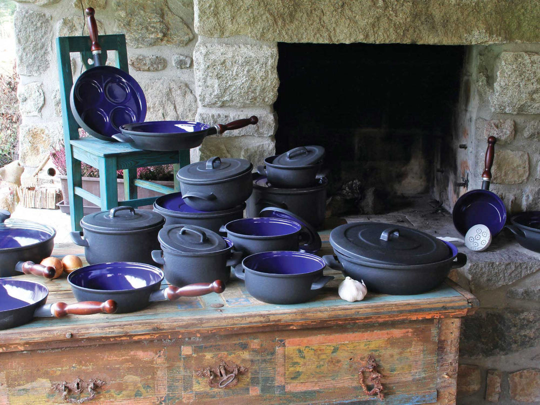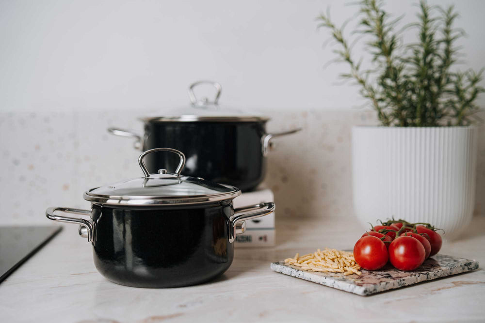 A special matt black enamel on the outside gives the pots a rustic look. Inside, a classic cobalt blue enamel shines, sealing the steel to make it cut and scratch resistant.