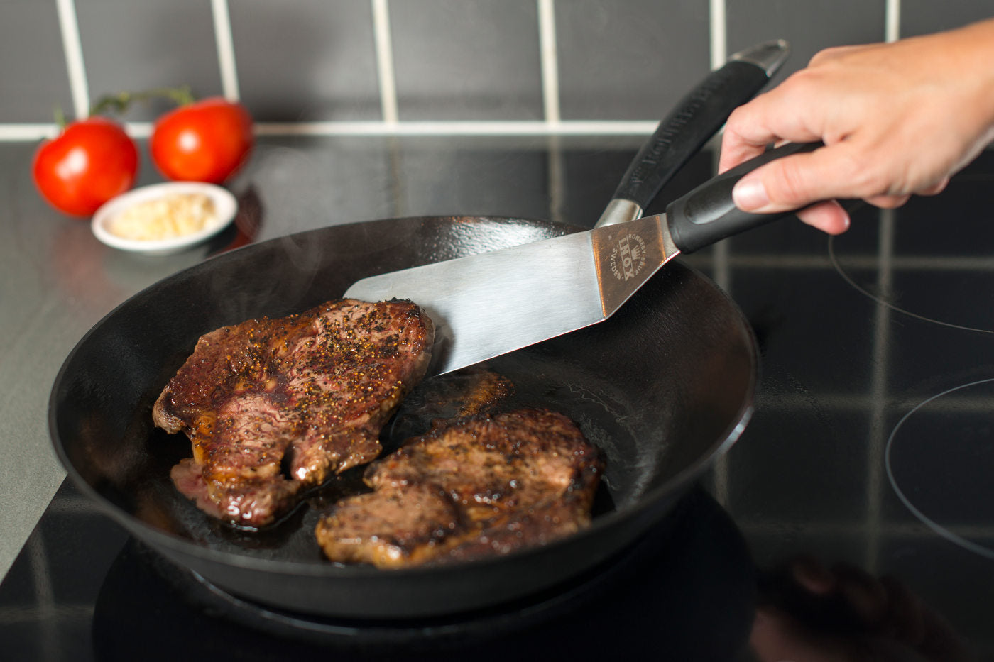 Raw cast iron pans have no artificial coating and are therefore extremely robust and, in principle, scratch-resistant. However, metal kitchen utensils, forks or knife edges can damage the baked-on coating or patina. We therefore recommend the use of wooden/bamboo, plastic or silicone kitchen utensils in raw cast iron pans to protect the painstakingly maintained patina.