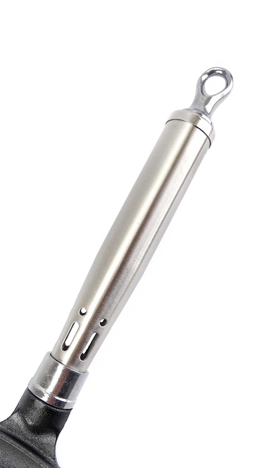 The other is the stainless steel handle. It has a tubular design and therefore hardly gets warm when used on the hob. The biggest advantage of the stainless steel handle is that it is fully ovenproof (also suitable for grills and open fires), which significantly extends the range of uses for the Maestro cast iron pan.